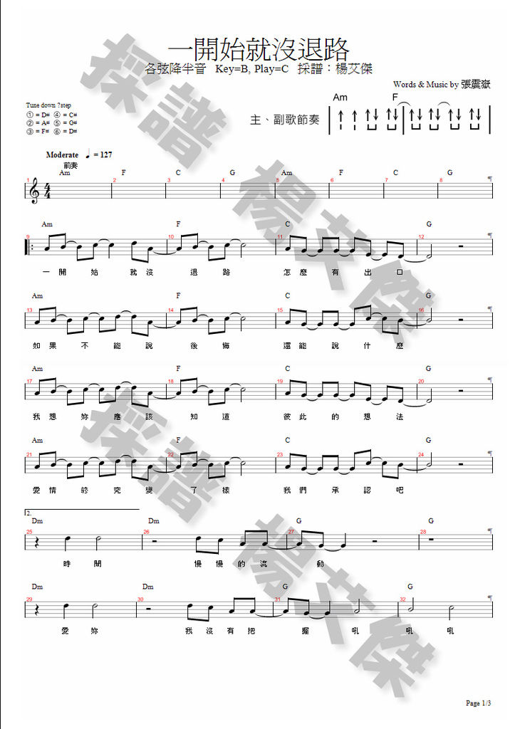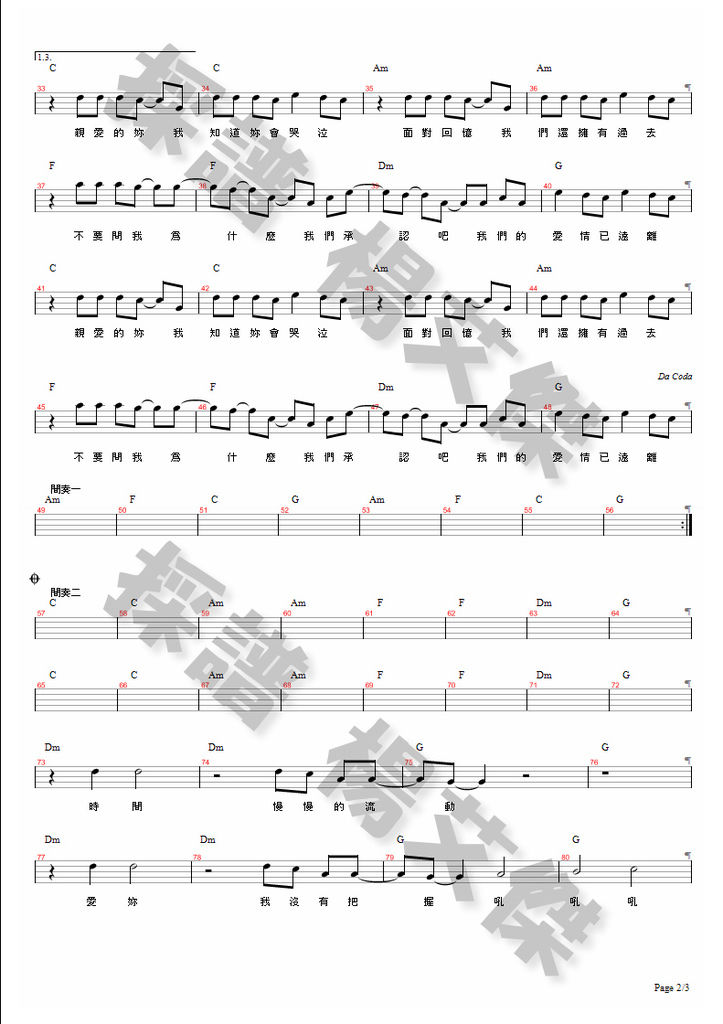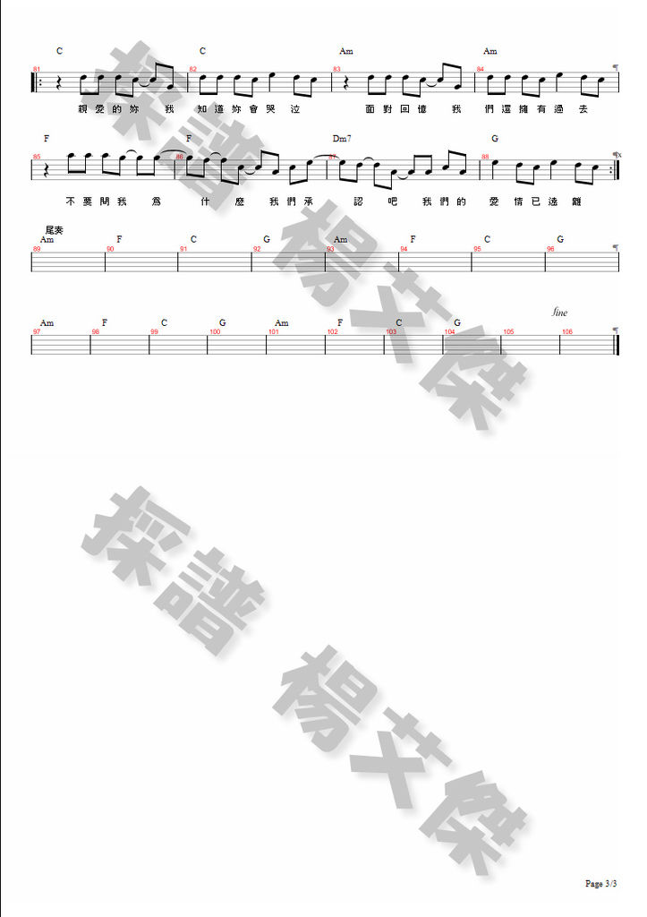 3.吉他的節奏,以兩小節為一單位,主副歌相同!