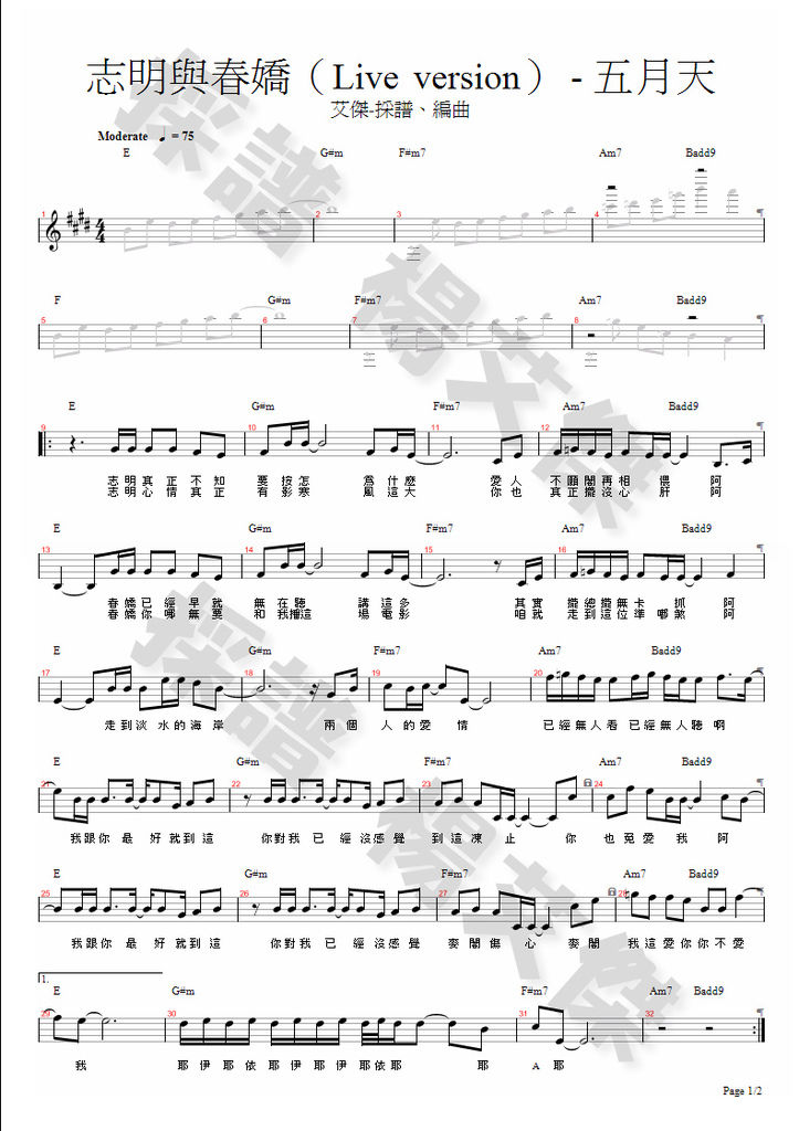 小節跟和弦都標註的很清楚,完全照原曲走,另有些小節上方有附註彈會法;比較少用的和弦我也會做出和弦表放在譜面上方。