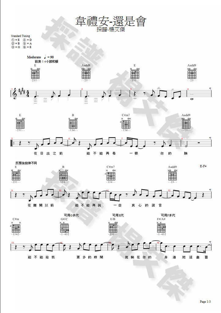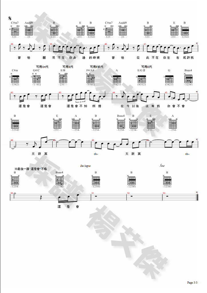 2.這首歌在13~16小節、26~27小節、還有42~43小節,因為編入了BASS Line,硬要用一把吉他來彈,導致和弦不是很好按,也且也不方便刷扣,所以我用文字標註了原和弦的彈法,就是"可用F#代"字樣的部分,只要照這個彈就OK~