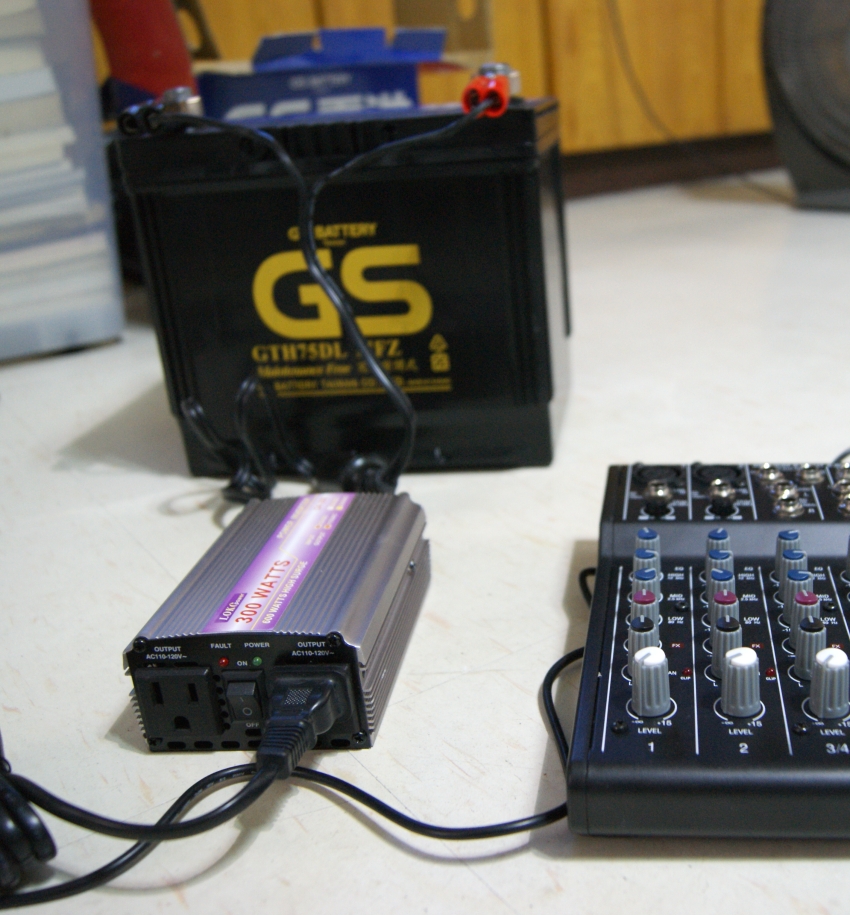 一般來說音箱要吃110V的交流電(AC),但因為發電機大、重、貴、聲音又非常吵,所以用車用電池(一般是鉛酸電池)來替代發電機是一個非常棒的方法。
