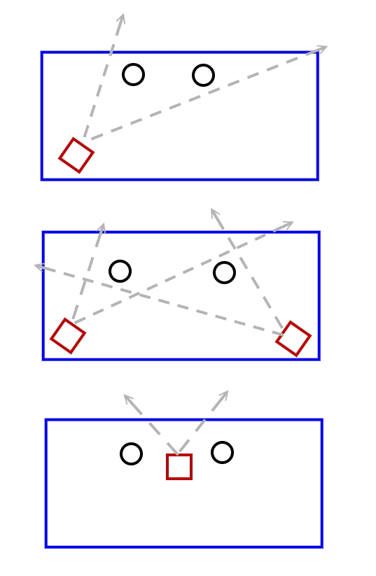圖1只用一顆喇叭,就可以達到監聽及外場的效果,但缺點就是右邊那個人聽到的聲音會比較小;圖2則用兩顆喇叭來做涵蓋,雖然右邊那個人並沒有被左邊的喇叭覆蓋,但他可以清楚的聽到右邊喇叭的聲音,而且外場涵蓋的範圍也很大;圖3的擺設就比較差,這樣的擺設有可能造成『觀眾聽到很大聲,而演出者聽不到監聽』的情形!且外場的覆蓋情形也不完善。